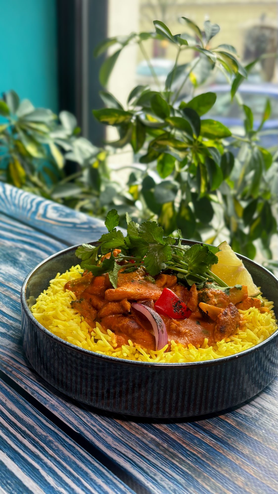 Miks sałat, rukola, wołowina chimichurri, pestki granatu, ogórek zielony, orzechy nerkowca prażone, pieczone ziemniaczki, lekko pikantny sos winegret-chimichurri.